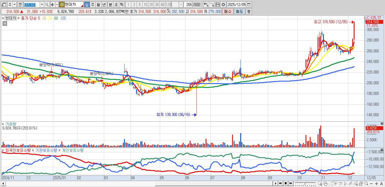 - 현대차 (315,000원 ▲ 11.11% , 시총: 644,987억, 거래량: 3,892,799, 거래대금:11,786억)