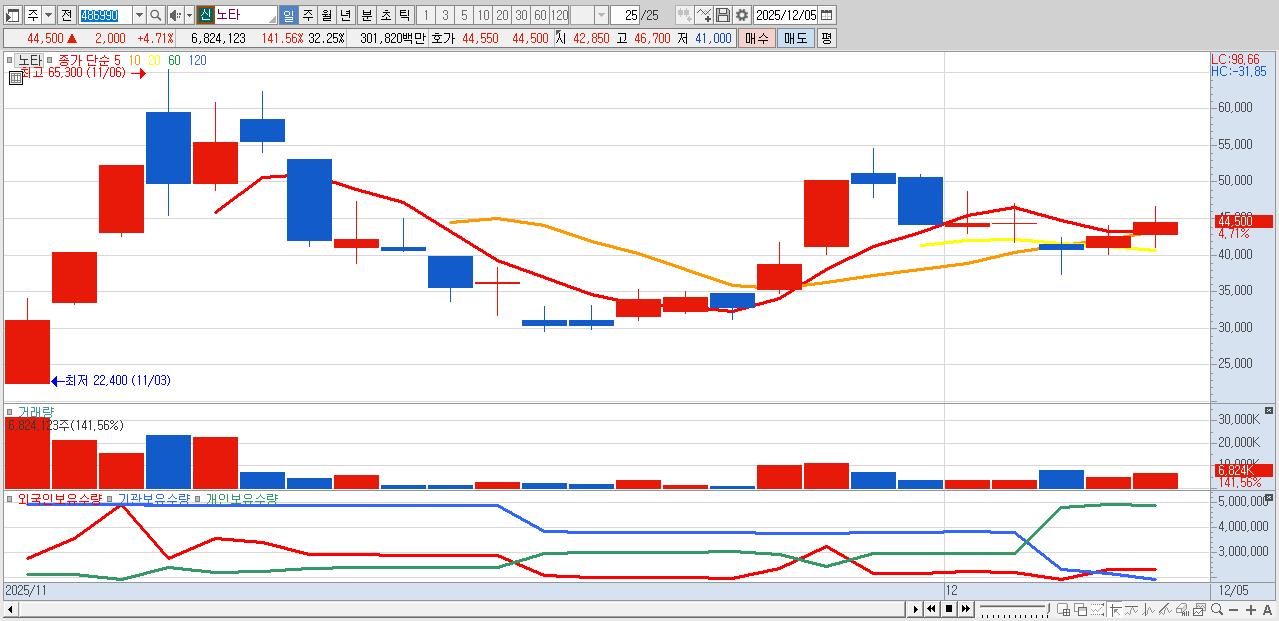 - 노타 (44,500원 ▲ 4.71% , 시총: 9,417억, 거래량: 6,824,123, 거래대금:3,018억)