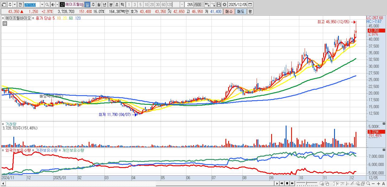 30.에이프릴바이오 43,350원 ▲ 2.97% (KOSDAQ, 397030)