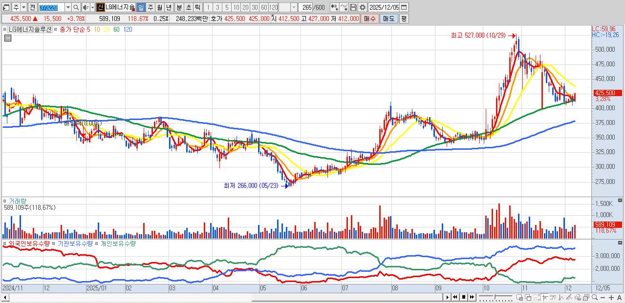 - LG에너지솔루션 (426,000원 ▲ 3.9% , 시총: 996,840억, 거래량: 438,931, 거래대금:1,851억)