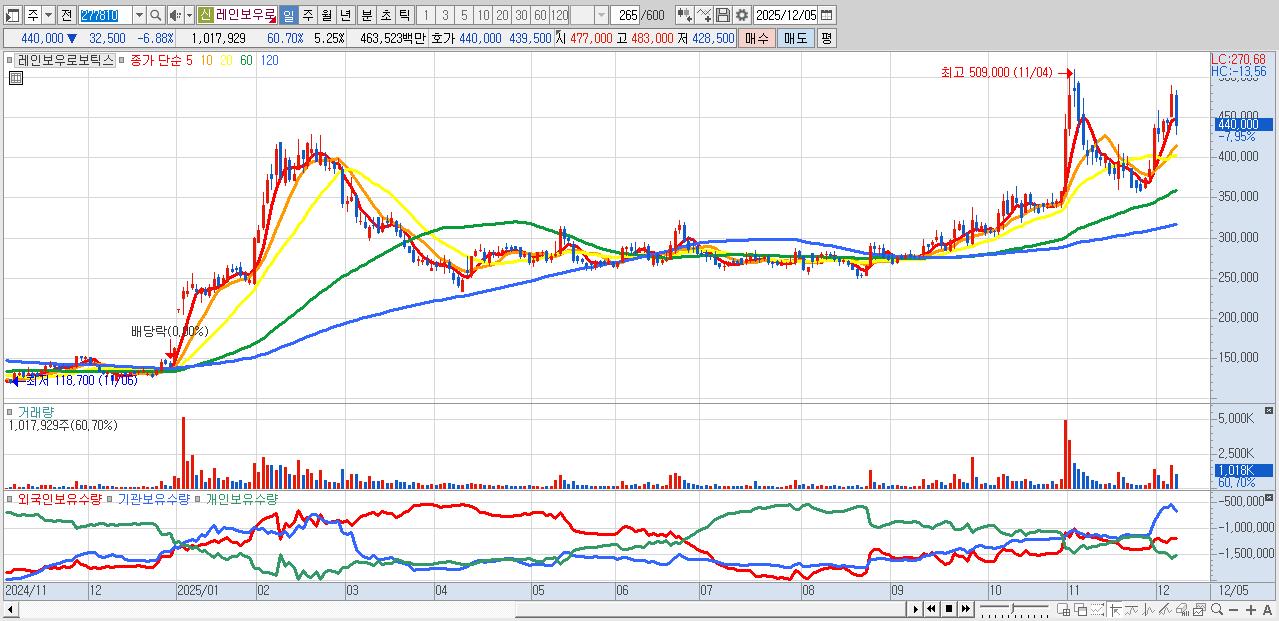 - 레인보우로보틱스 (438,500원 ▼ -7.2% , 시총: 85,068억, 거래량: 489,344, 거래대금:2,221억)