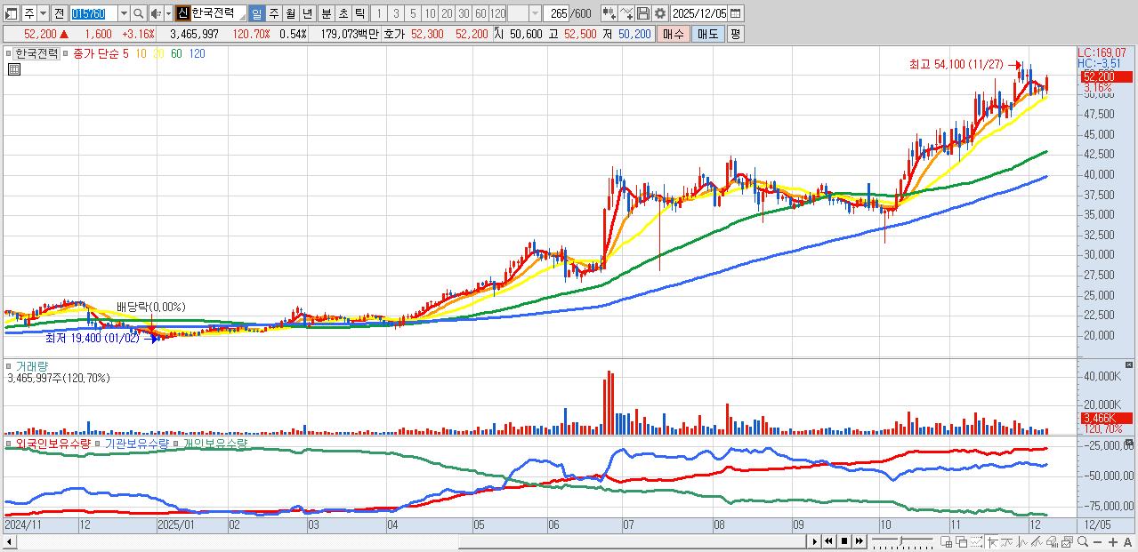 - 한국전력 (52,200원 ▲ 3.16% , 시총: 335,105억, 거래량: 3,465,997, 거래대금:1,791억)