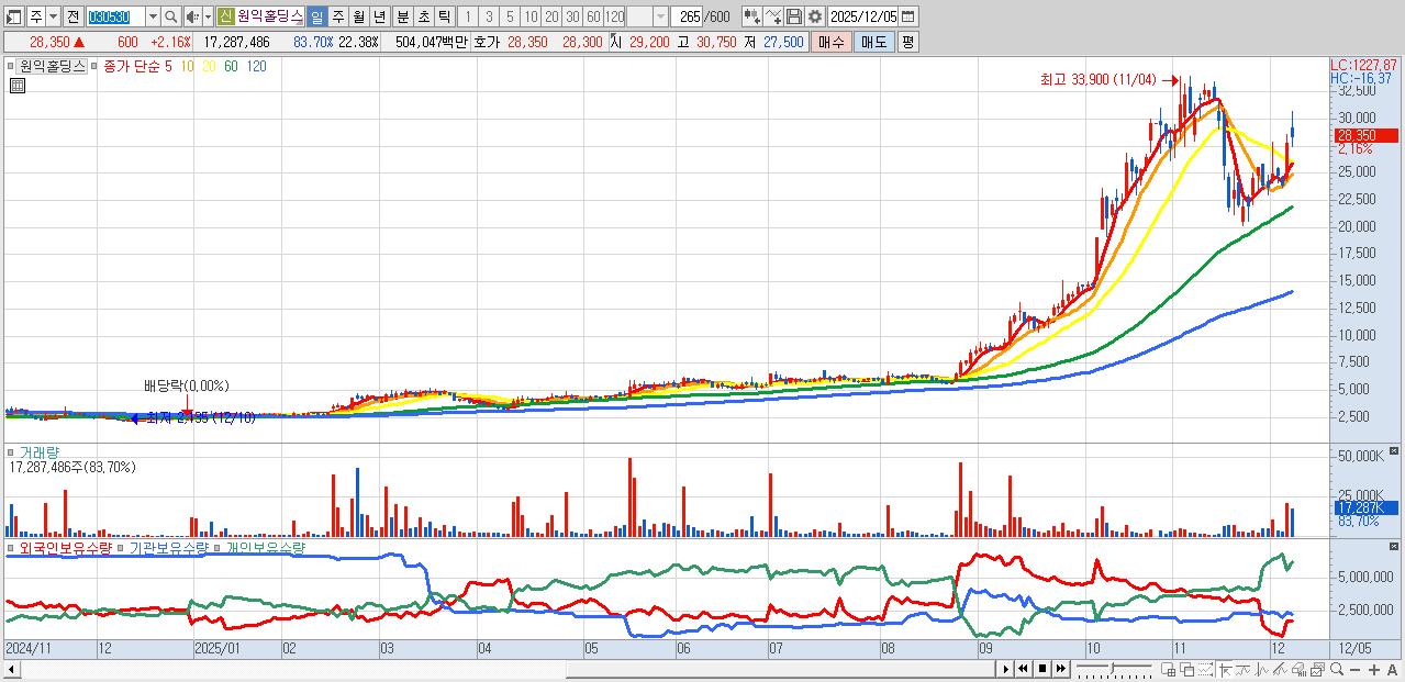 - 원익홀딩스 (28,350원 ▲ 2.16% , 시총: 21,897억, 거래량: 17,287,486, 거래대금:5,040억)
