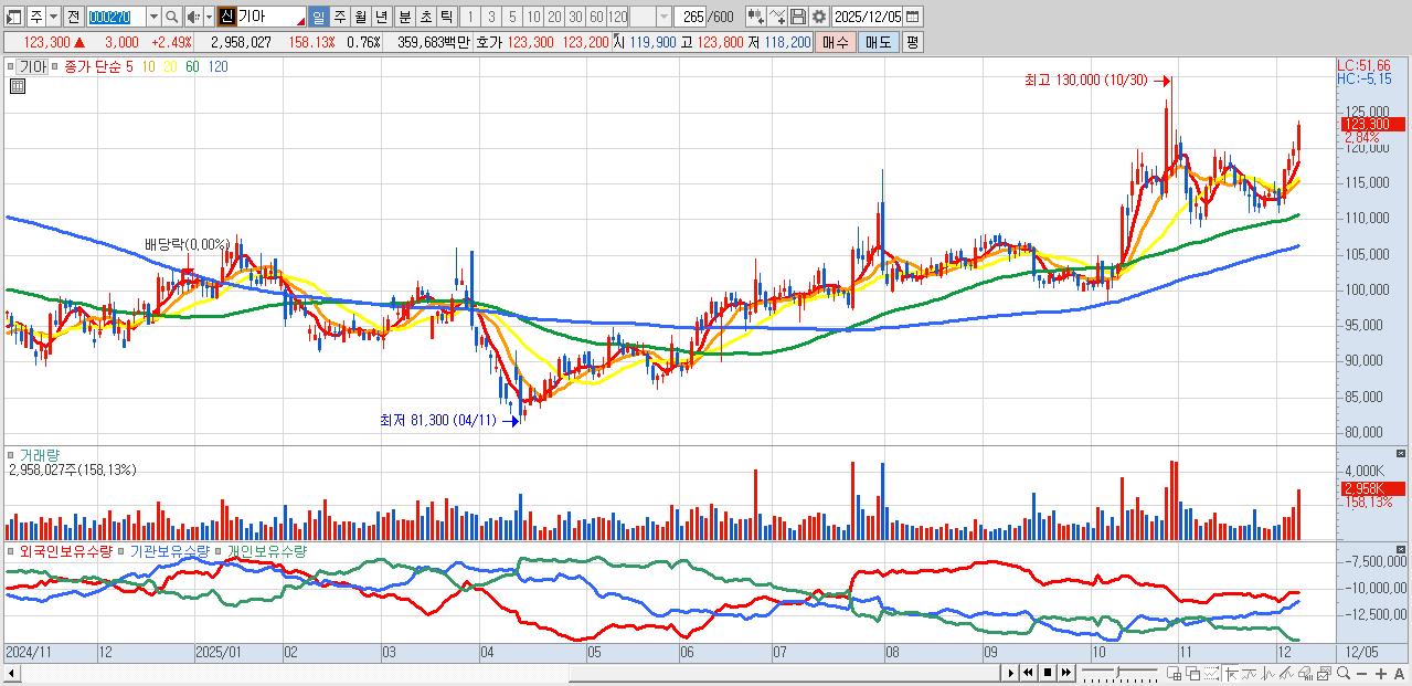 - 기아 (123,600원 ▲ 2.74% , 시총: 482,550억, 거래량: 2,075,345, 거래대금:2,522억)