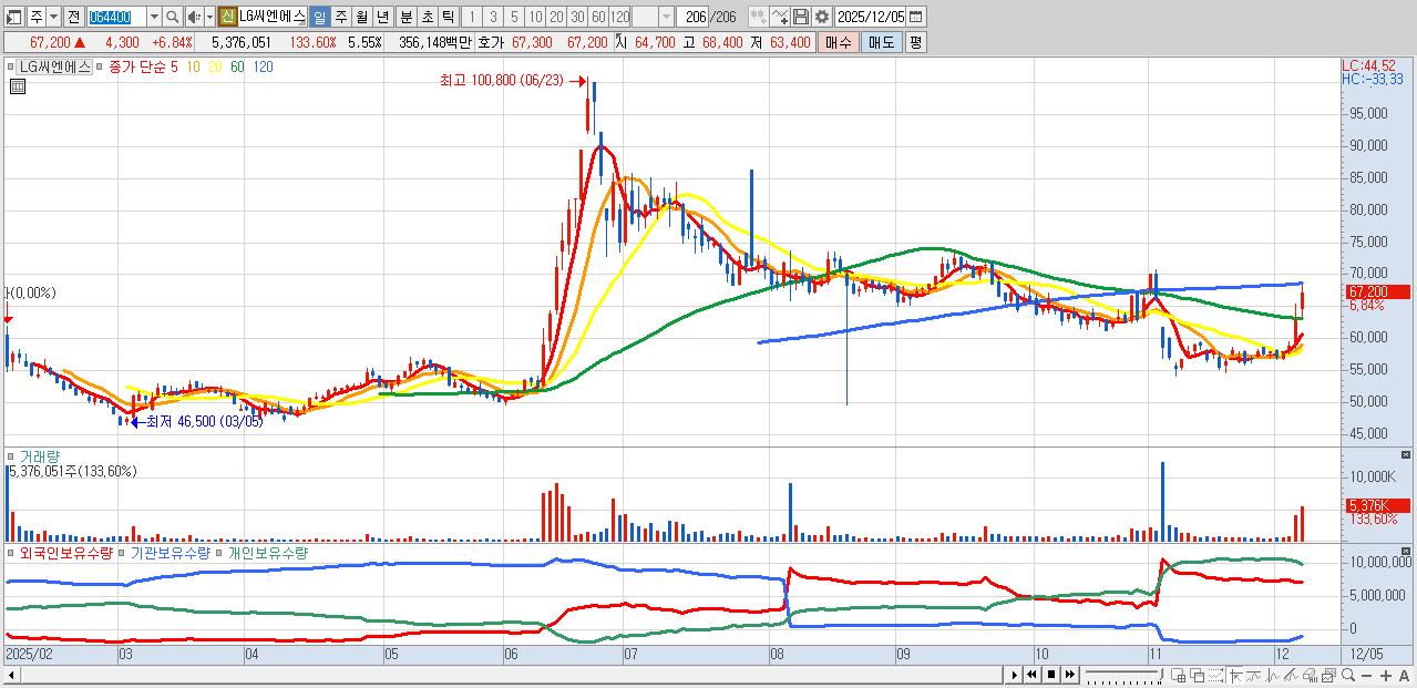 - LG씨엔에스 (67,200원 ▲ 6.84% , 시총: 65,107억, 거래량: 5,376,051, 거래대금:3,561억)