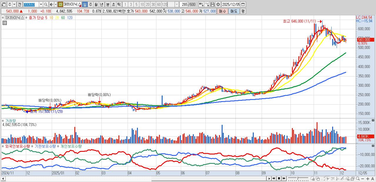 - SK하이닉스 (544,000원 ▲ 0.37% , 시총: 3,960,333억, 거래량: 3,204,933, 거래대금:17,189억)