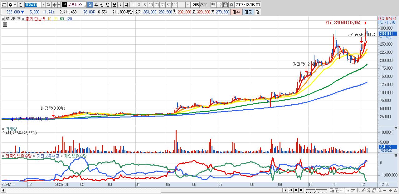 - 로보티즈 (283,000원 ▼ -1.74% , 시총: 41,233억, 거래량: 2,411,463, 거래대금:7,118억)