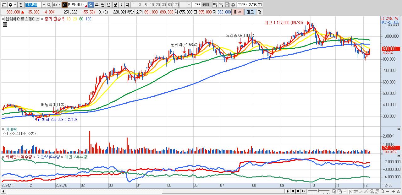 - 한화에어로스페이스 (895,000원 ▲ 4.68% , 시총: 461,492억, 거래량: 192,198, 거래대금:1,686억)