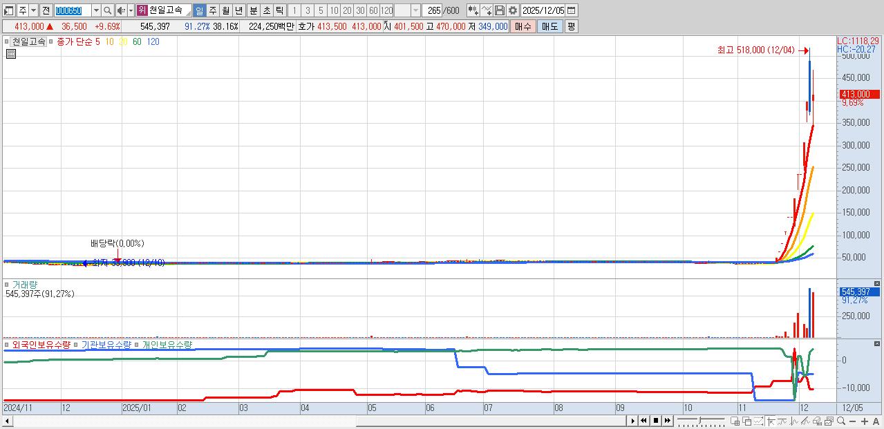 - 천일고속 (413,000원 ▲ 9.69% , 시총: 5,903억, 거래량: 545,397, 거래대금:2,243억)
