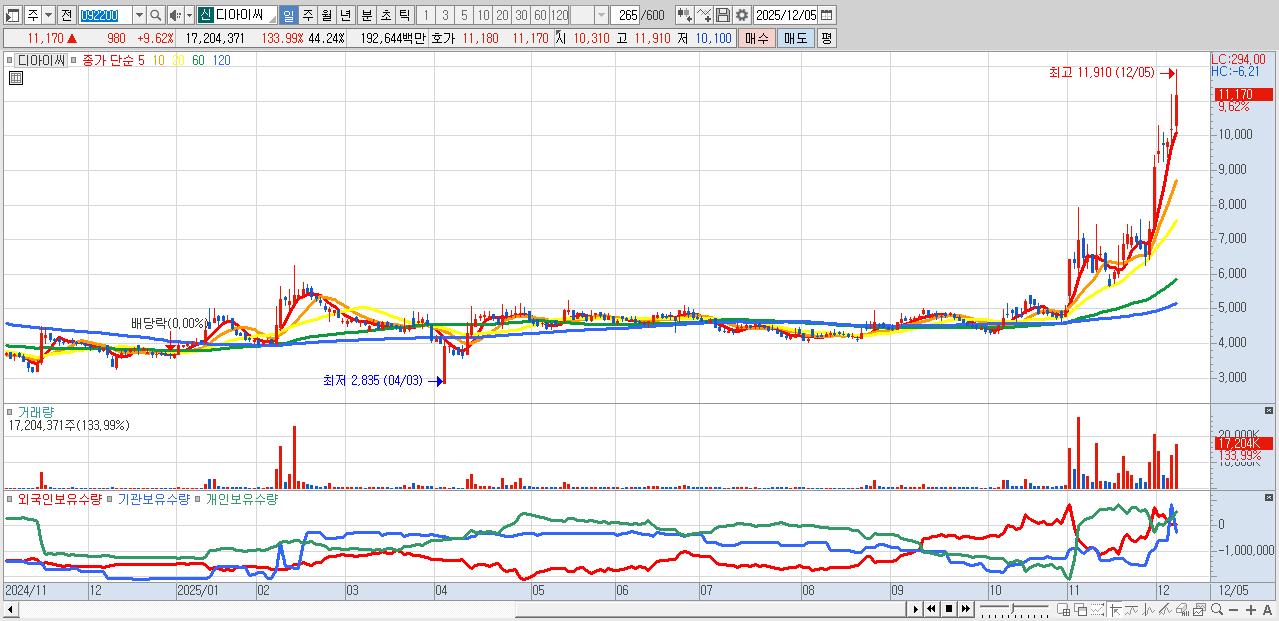 - 디아이씨 (11,170원 ▲ 9.62% , 시총: 4,344억, 거래량: 17,204,371, 거래대금:1,926억)