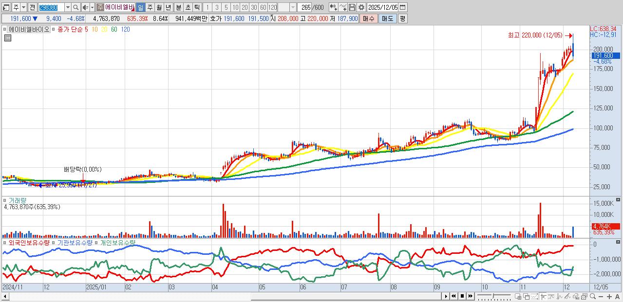 - 에이비엘바이오 (190,600원 ▼ -5.17% , 시총: 105,069억, 거래량: 2,635,907, 거래대금:5,193억)