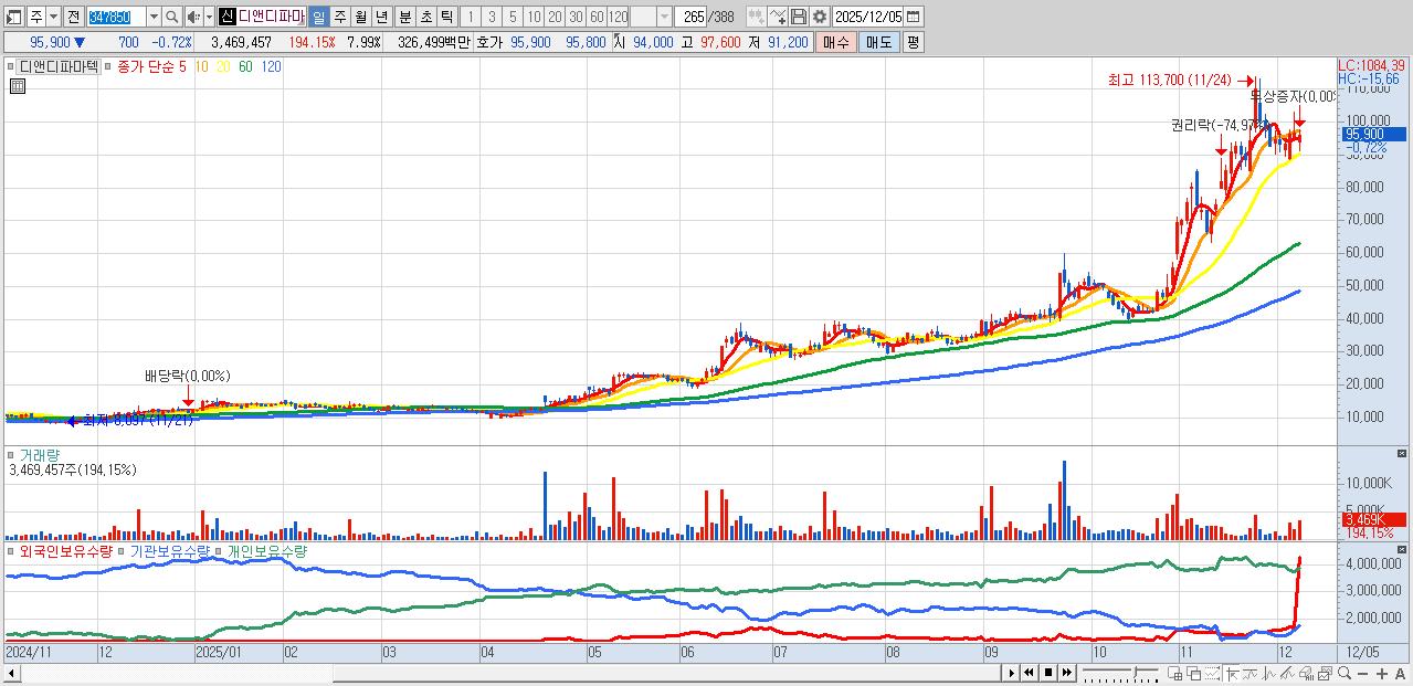 - 디앤디파마텍 (95,900원 ▼ -0.72% , 시총: 41,645억, 거래량: 3,469,457, 거래대금:3,265억)