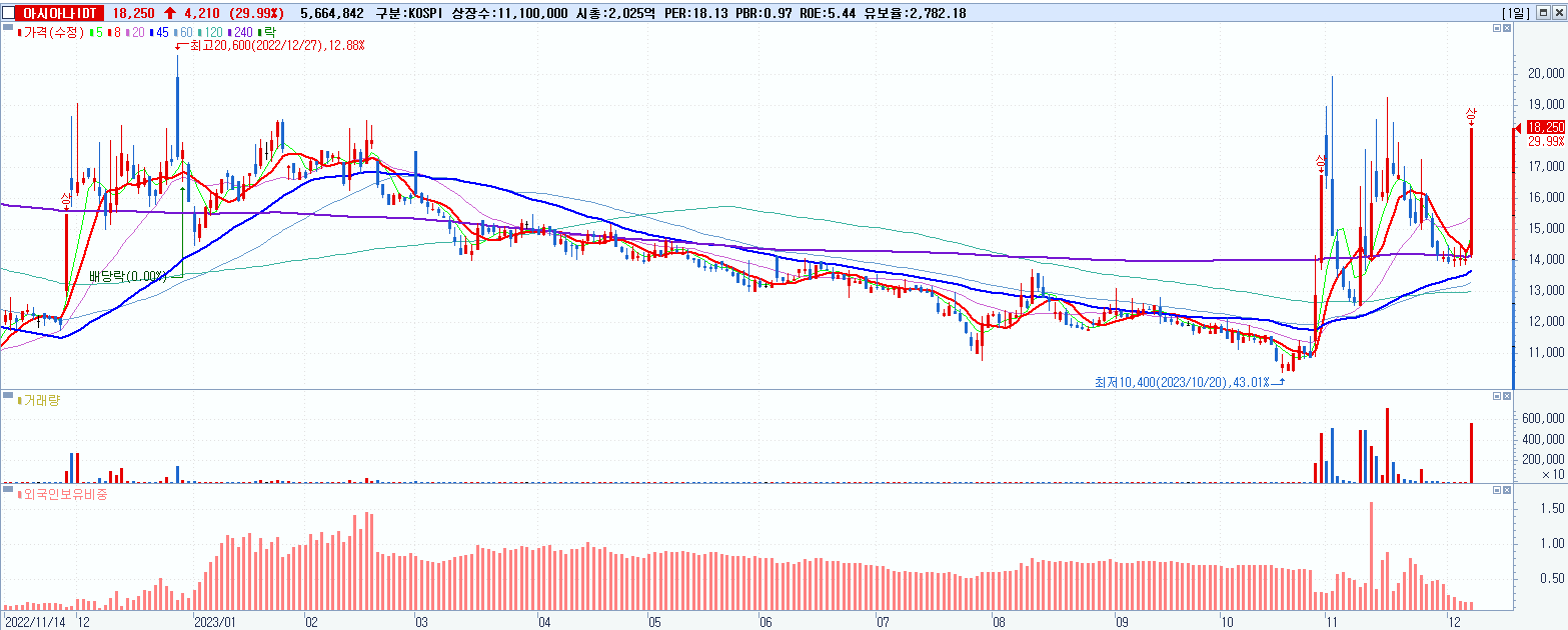 - 아시아나IDT (18,250원 ▲ 29.99% , 시총: 2,026억, 거래량: 5,665,116, 거래대금:971억)