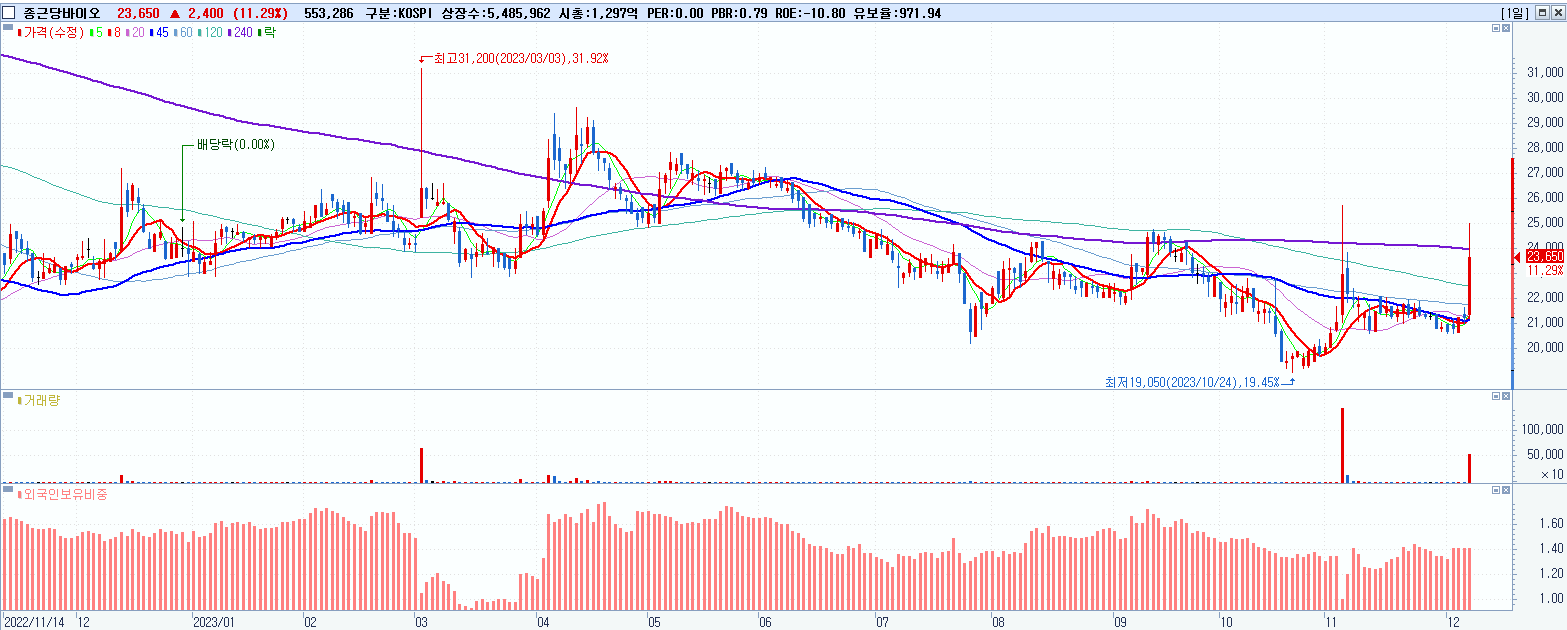 - 종근당바이오 (23,650원 ▲ 11.29% , 시총: 1,297억, 거래량: 553,483, 거래대금:130억)