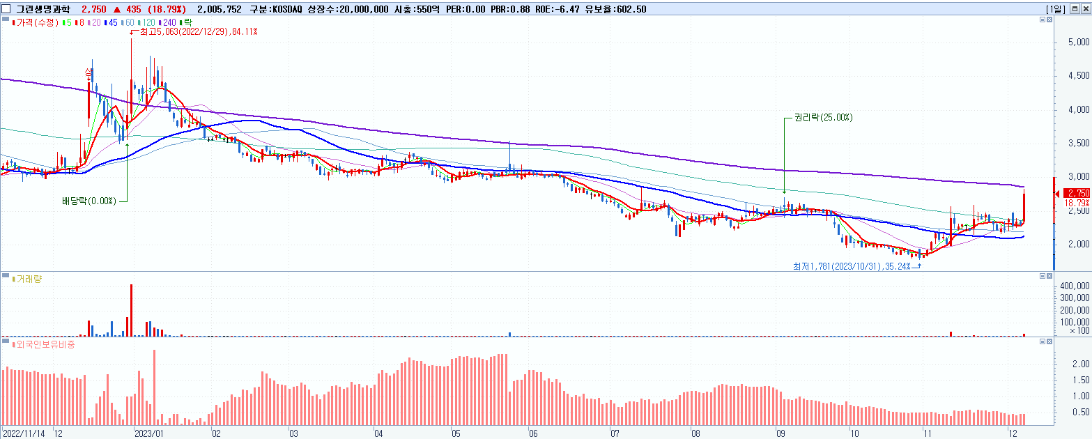 - 그린생명과학 (2,750원 ▲ 18.79% , 시총: 550억, 거래량: 2,009,759, 거래대금:53억)