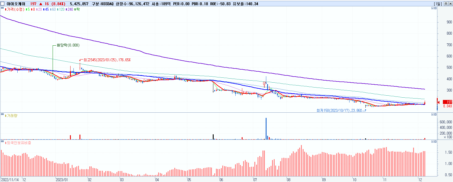 - 아이오케이 (197원 ▲ 8.84% , 시총: 189억, 거래량: 5,428,682, 거래대금:11억)