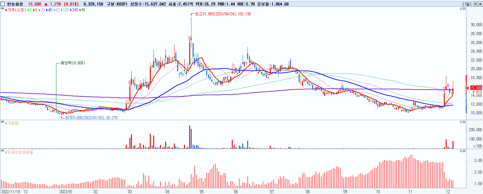 - 한농화성 (15,680원 ▲ 8.81% , 시총: 2,452억, 거래량: 8,329,599, 거래대금:1,369억)