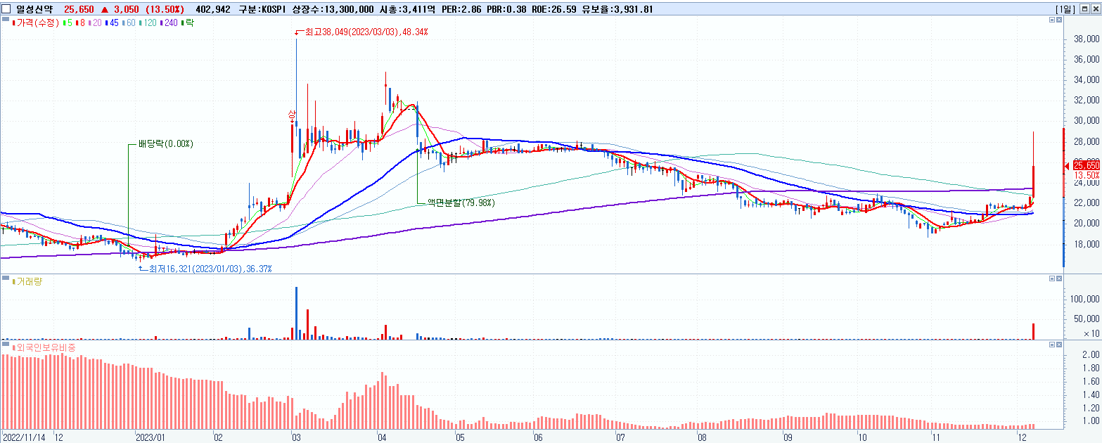 - 일성신약 (25,650원 ▲ 13.5% , 시총: 3,411억, 거래량: 403,204, 거래대금:107억)