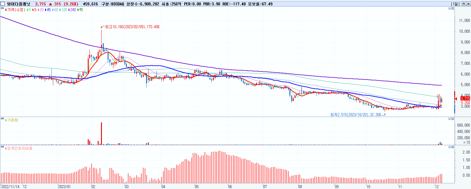 - 와이더플래닛 (3,715원 ▲ 9.26% , 시총: 257억, 거래량: 459,617, 거래대금:17억)