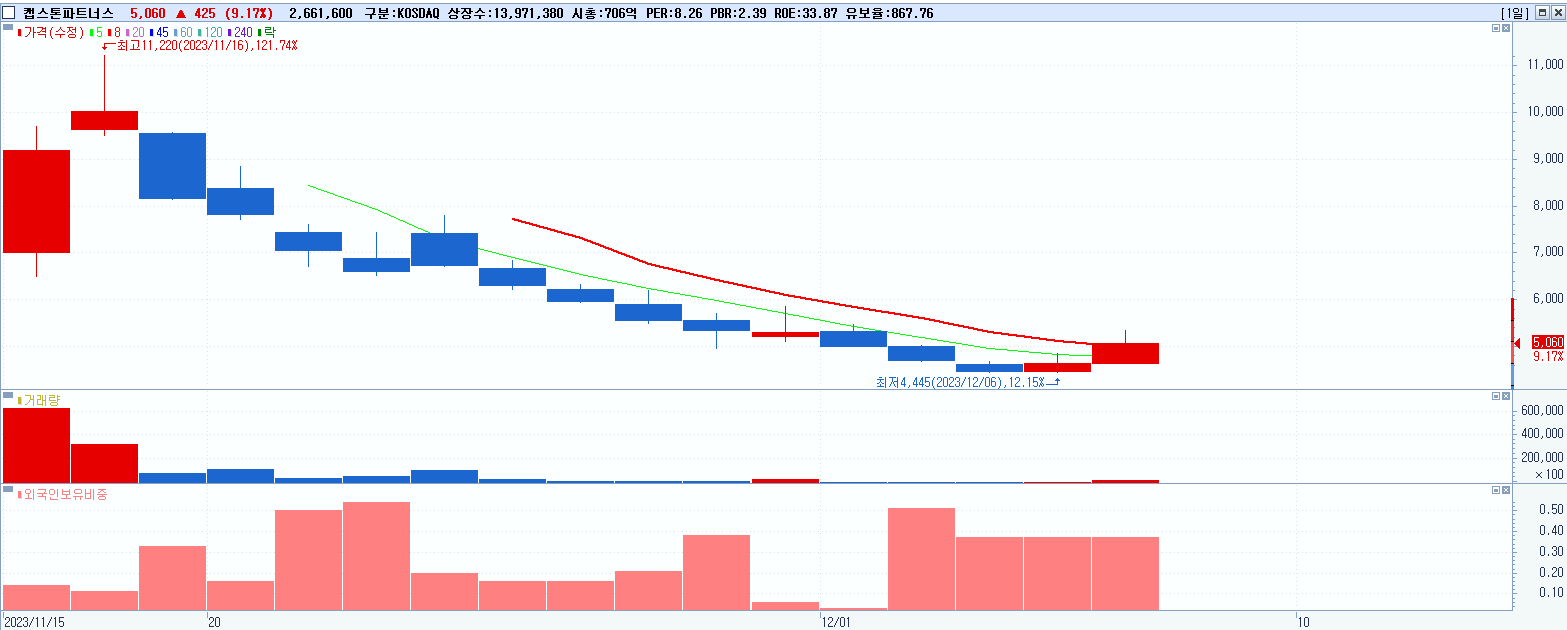 - 캡스톤파트너스 (5,060원 ▲ 9.17% , 시총: 707억, 거래량: 2,662,550, 거래대금:136억)