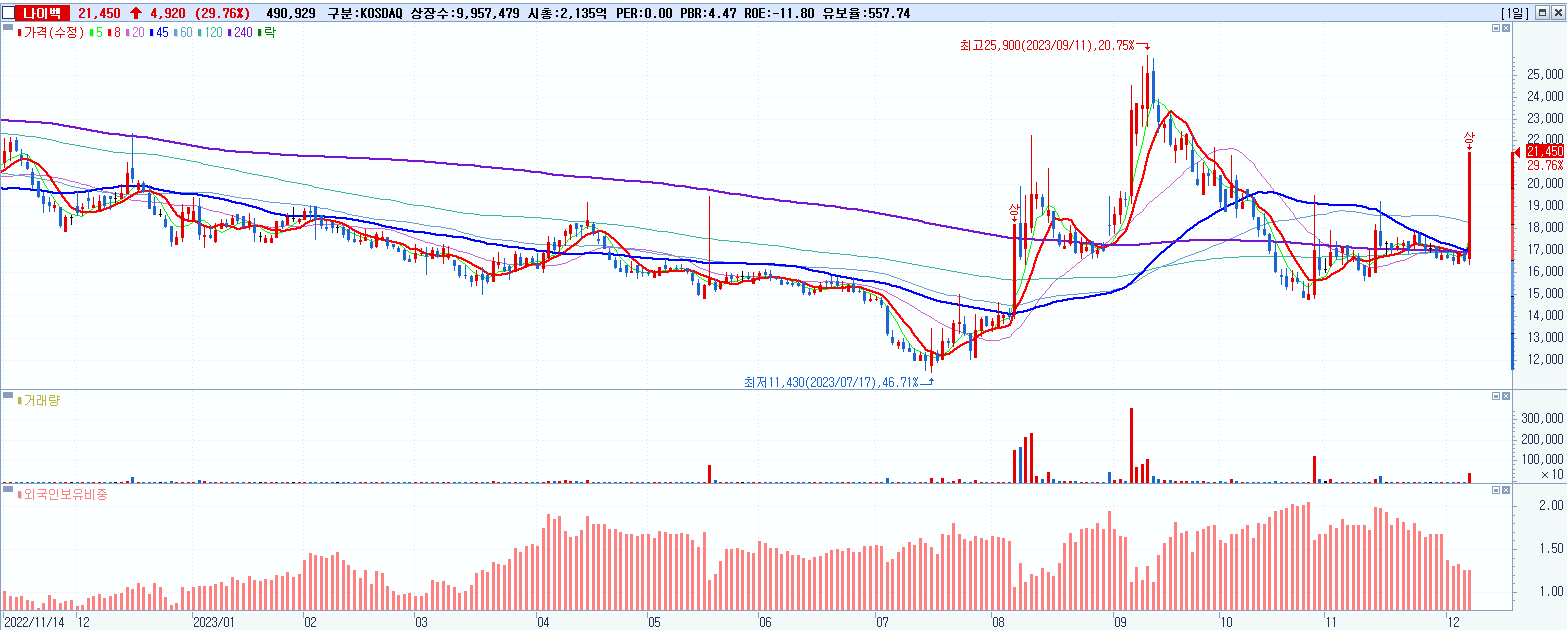 - 나이벡 (21,450원 ▲ 29.76% , 시총: 2,136억, 거래량: 490,939, 거래대금:101억)