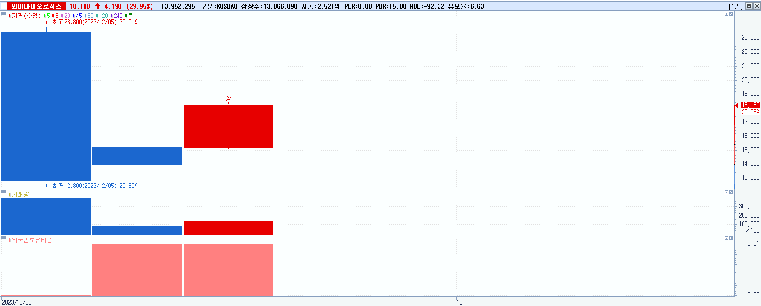 - 와이바이오로직스 (18,180원 ▲ 29.95% , 시총: 2,521억, 거래량: 13,952,771, 거래대금:2,345억)