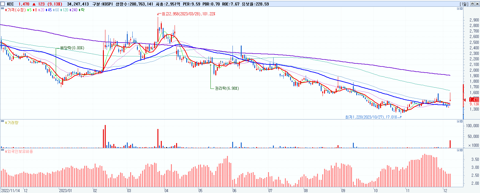 - KEC (1,470원 ▲ 9.13% , 시총: 2,951억, 거래량: 34,251,483, 거래대금:520억)