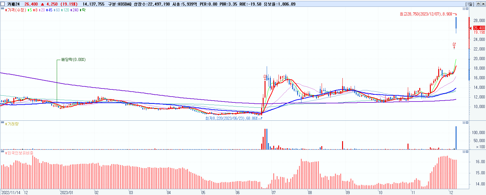 - 카페24 (26,400원 ▲ 19.19% , 시총: 5,939억, 거래량: 14,145,902, 거래대금:3,842억)