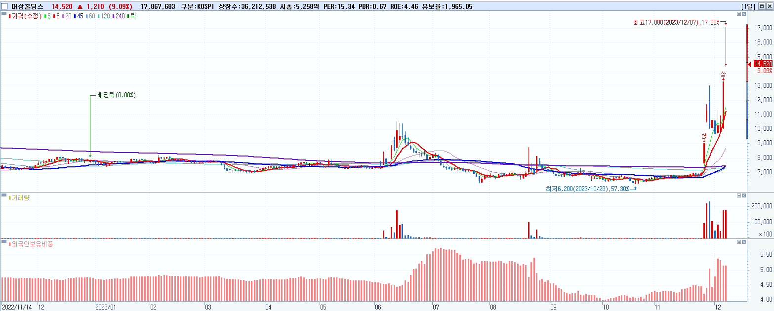 - 대상홀딩스 (14,520원 ▲ 9.09% , 시총: 5,258억, 거래량: 17,888,761, 거래대금:2,877억)