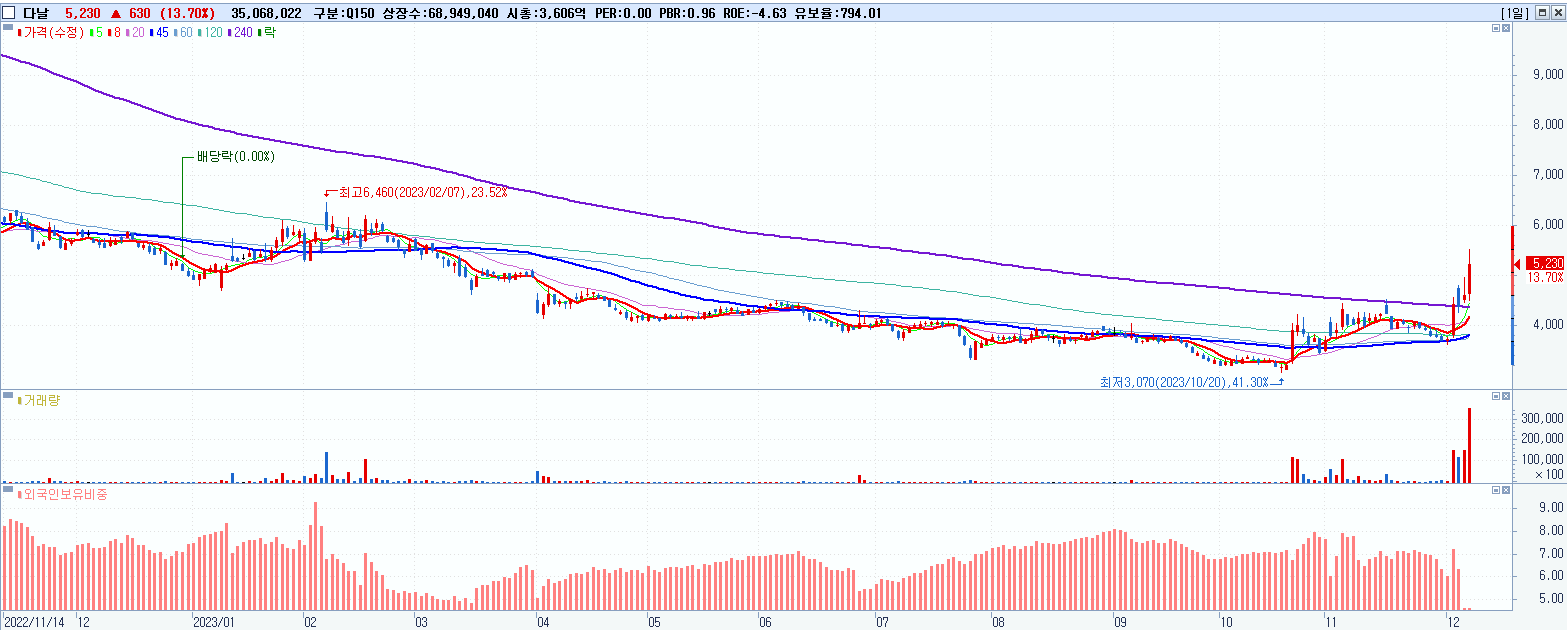 - 다날 (5,230원 ▲ 13.7% , 시총: 3,606억, 거래량: 35,112,049, 거래대금:1,812억)