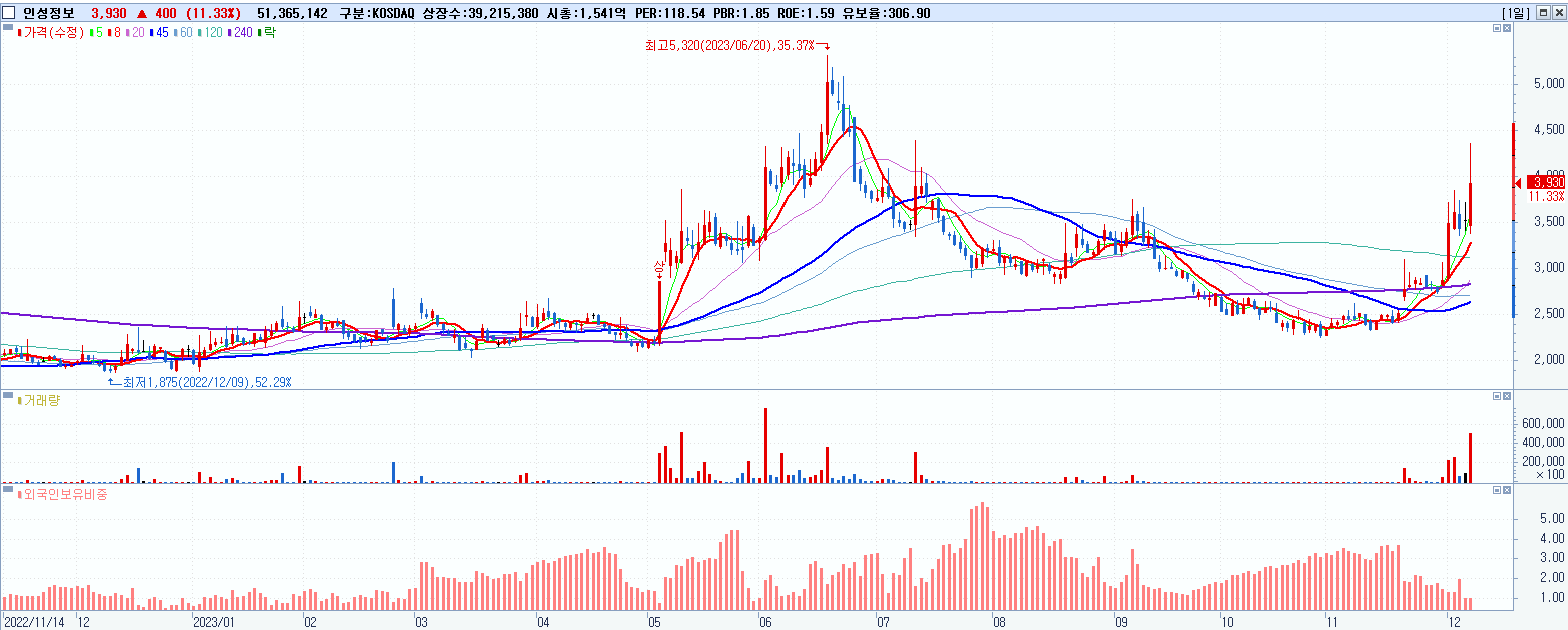 - 인성정보 (3,930원 ▲ 11.33% , 시총: 1,541억, 거래량: 51,403,520, 거래대금:2,063억)