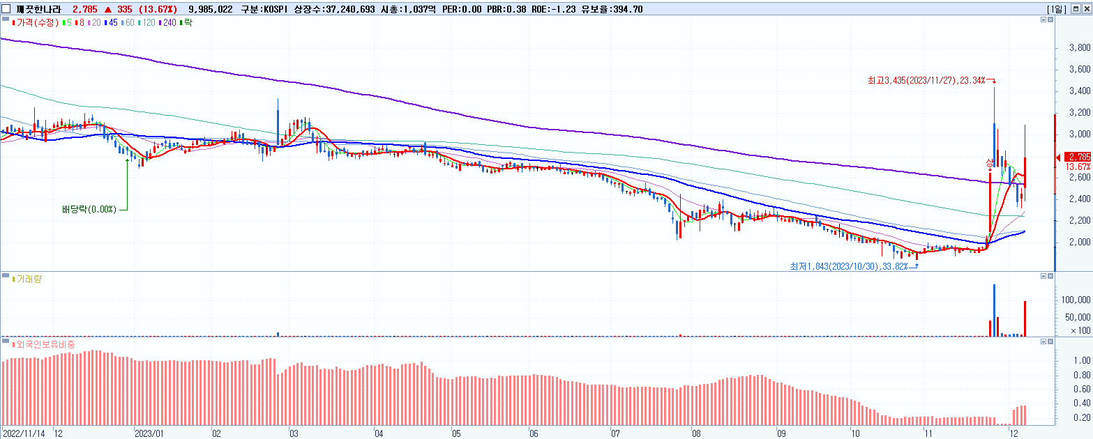 - 깨끗한나라 (2,785원 ▲ 13.67% , 시총: 1,037억, 거래량: 9,991,735, 거래대금:291억)