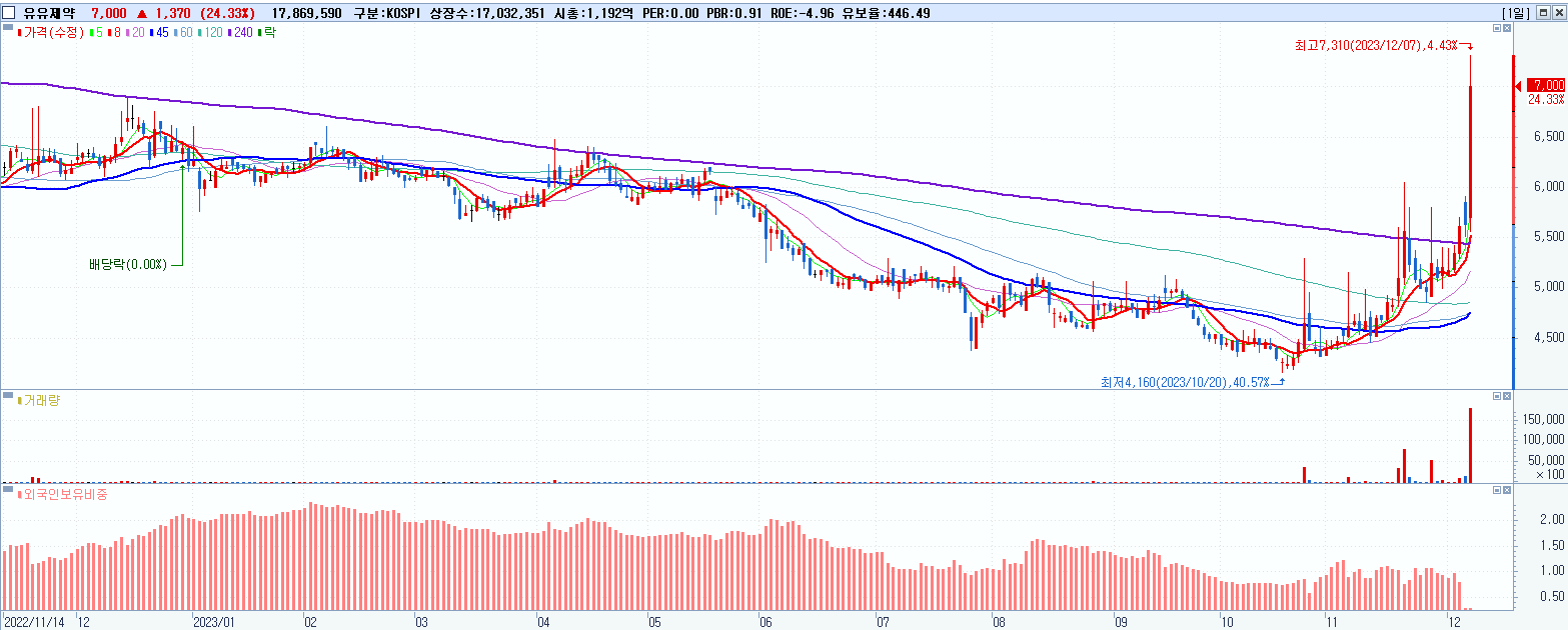 - 유유제약 (7,000원 ▲ 24.33% , 시총: 1,192억, 거래량: 17,890,741, 거래대금:1,229억)
