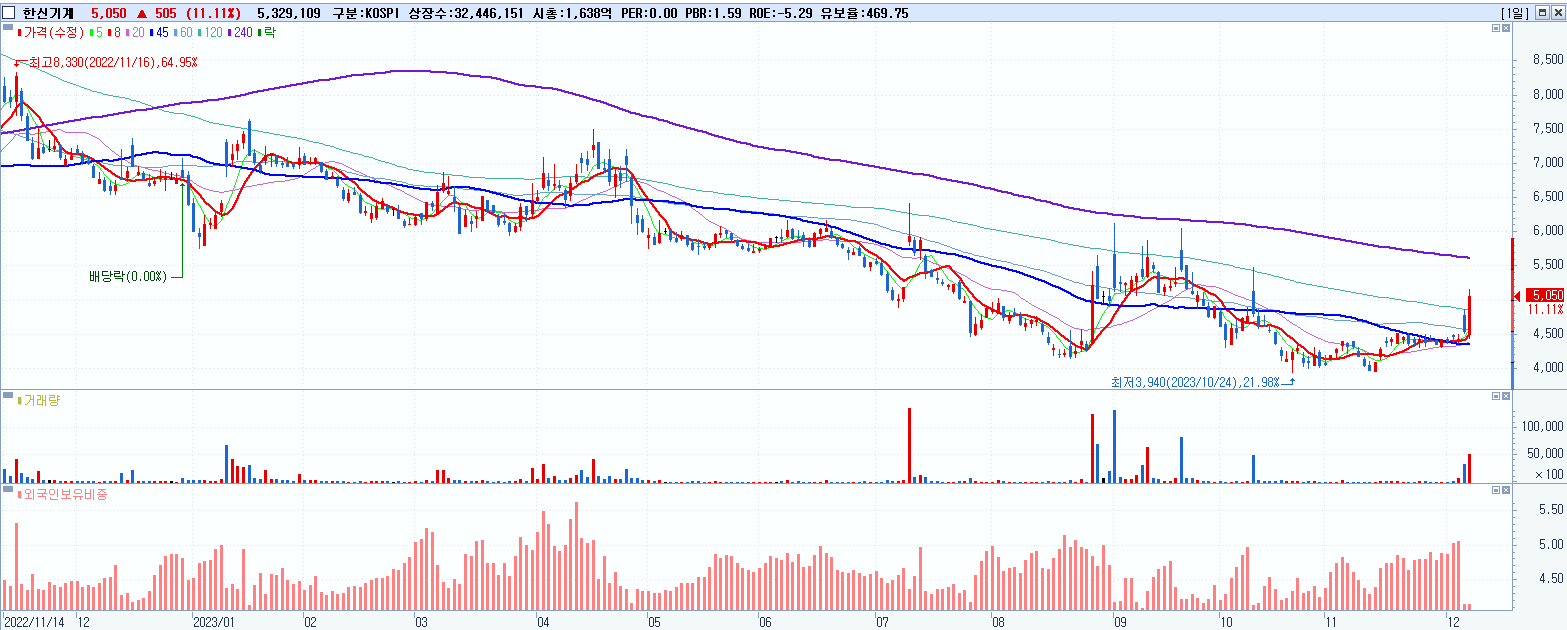 - 한신기계 (5,050원 ▲ 11.11% , 시총: 1,639억, 거래량: 5,355,561, 거래대금:263억)