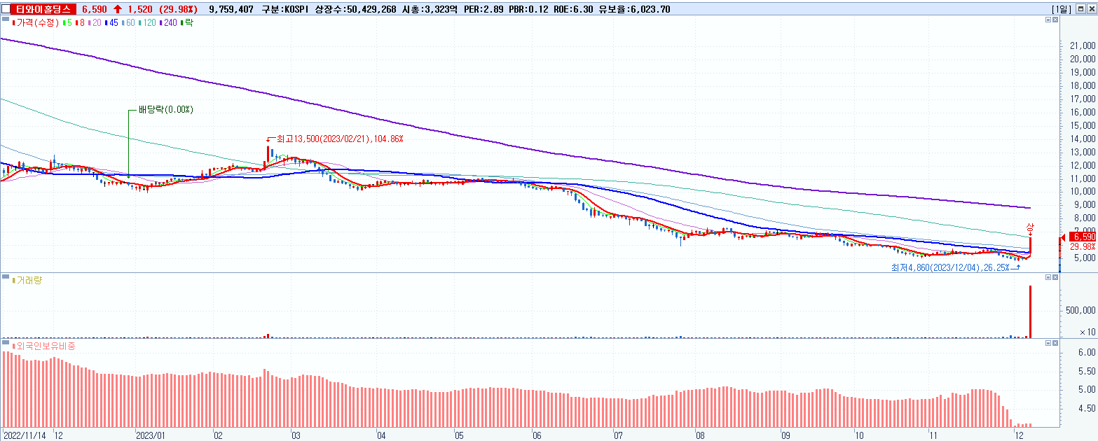 2.티와이홀딩스 6,590원 ▲ 29.98% (KOSPI, 363280)