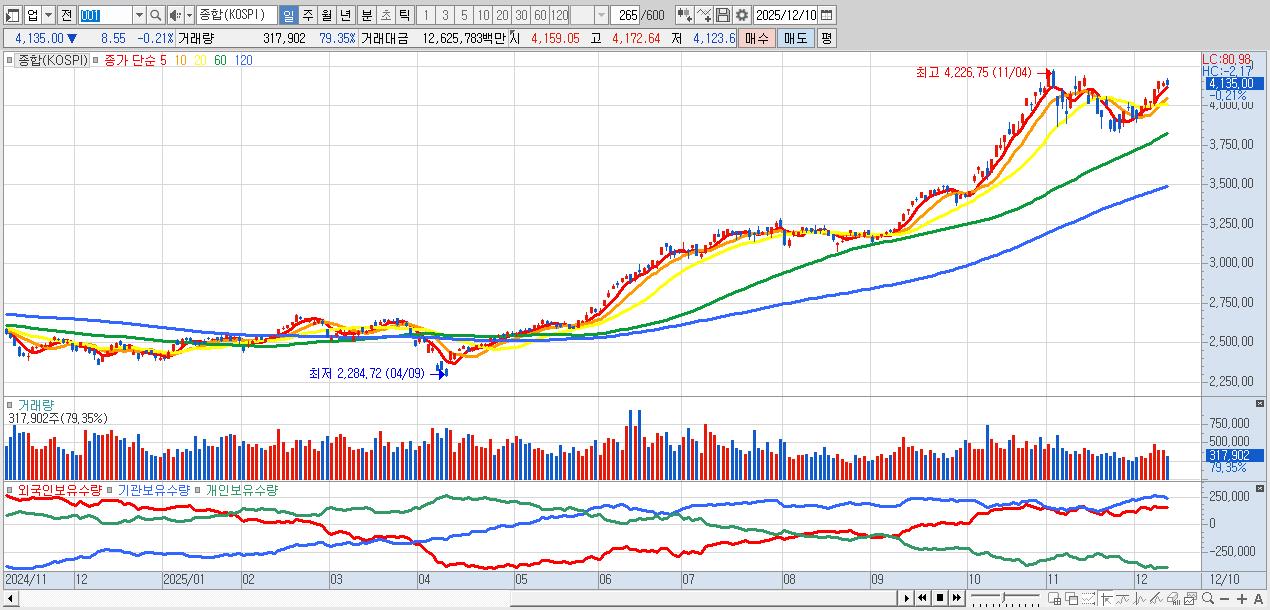 | 12/10 | 4,135.00 | ▼-0.21% | -889억 | 3,739억 | -3,003억 | 153억 |