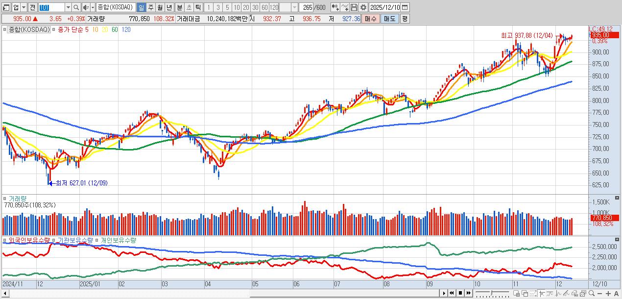 | 12/09 | 931.35 | ▲0.38% | 2,135억 | -581억 | -1,068억 | -486억 |