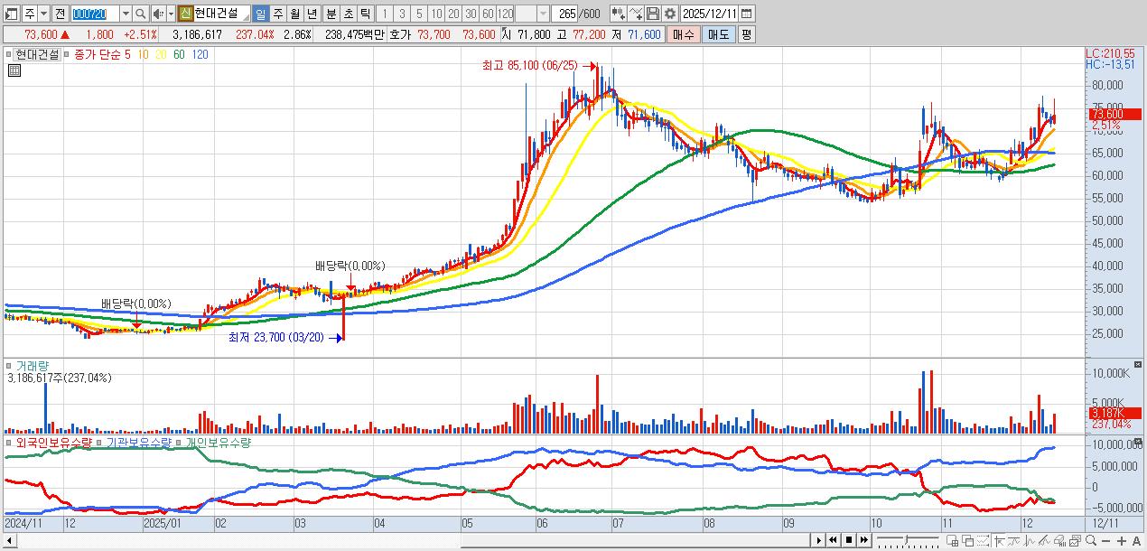 - 현대건설 (73,600원 ▲ 2.51% , 시총: 81,958억, 거래량: 3,186,617, 거래대금:2,385억)