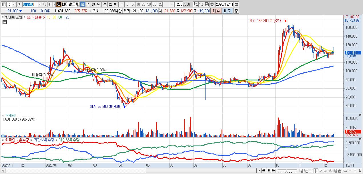 - 한미반도체 (121,000원 ▼ -0.08% , 시총: 115,328억, 거래량: 1,631,660, 거래대금:2,000억)