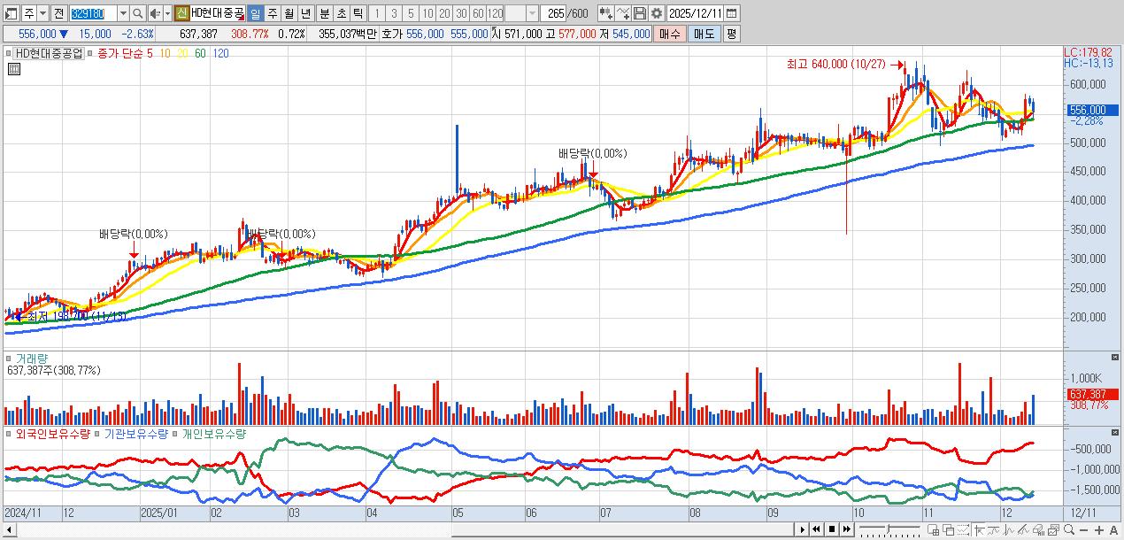 - HD현대중공업 (559,000원 ▼ -2.1% , 시총: 496,242억, 거래량: 566,185, 거래대금:3,152억)