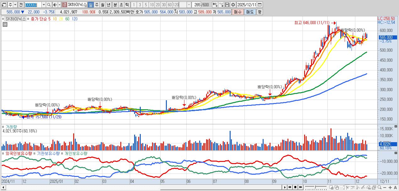 - SK하이닉스 (565,000원 ▼ -3.75% , 시총: 4,113,213억, 거래량: 4,021,907, 거래대금:23,095억)