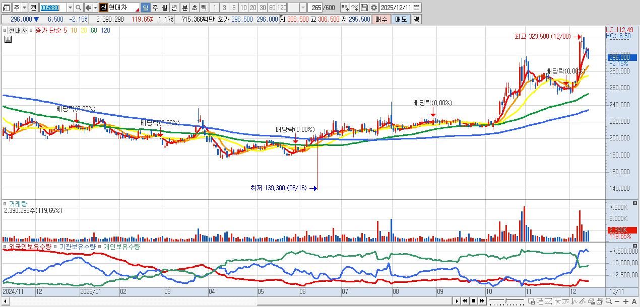 - 현대차 (295,500원 ▼ -2.31% , 시총: 605,059억, 거래량: 1,465,528, 거래대금:4,379억)