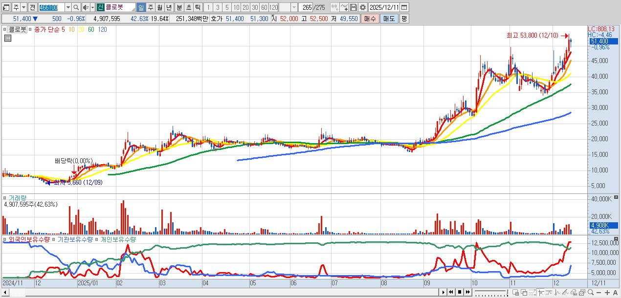 - 클로봇 (51,400원 ▼ -0.96% , 시총: 12,846억, 거래량: 4,907,595, 거래대금:2,513억)