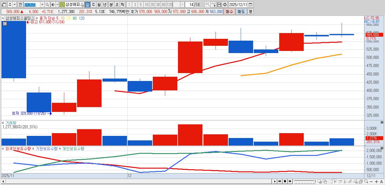 - 삼성에피스홀딩스 (569,000원 ▲ 0.71% , 시총: 141,585억, 거래량: 1,277,380, 거래대금:7,468억)
