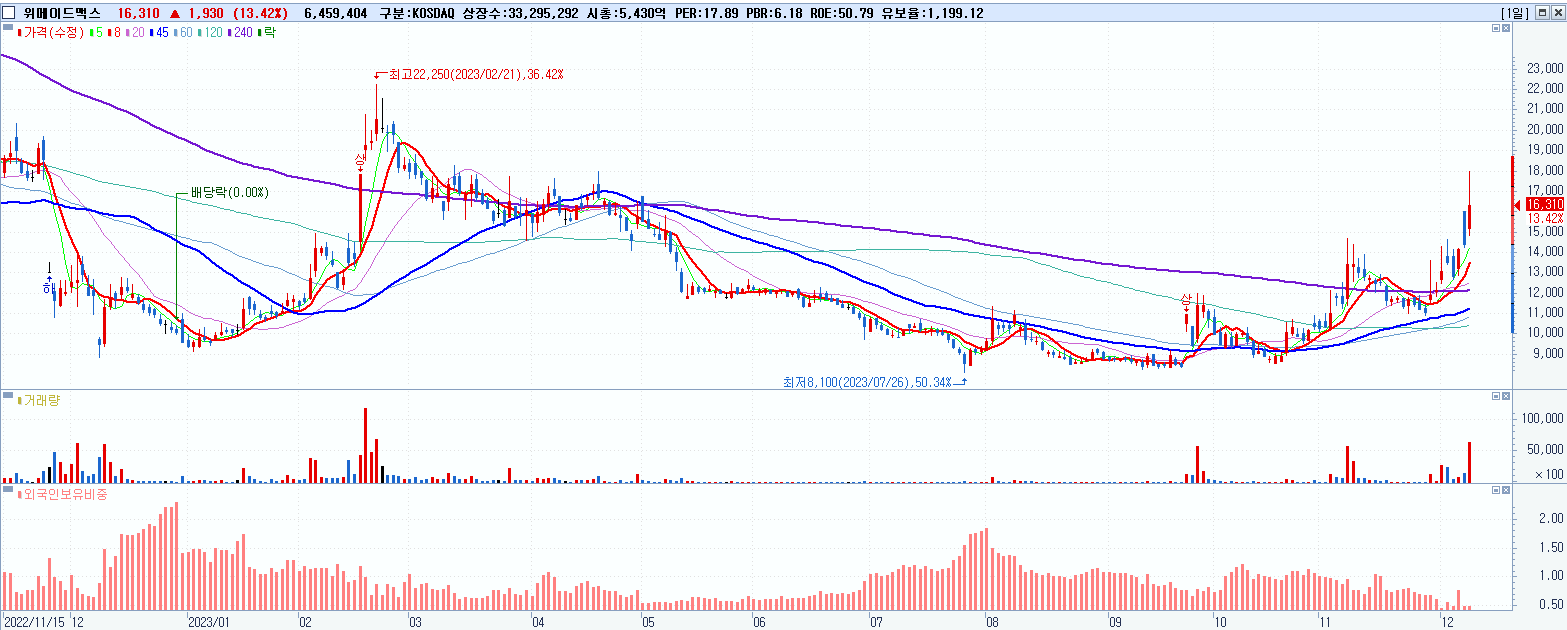 - 위메이드맥스 (16,310원 ▲ 13.42% , 시총: 5,430억, 거래량: 6,462,217, 거래대금:1,074억)