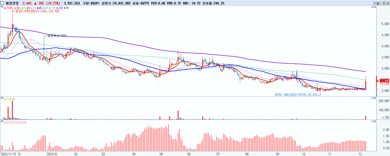 - 범양건영 (2,445원 ▲ 19.27% , 시총: 607억, 거래량: 3,937,534, 거래대금:94억)