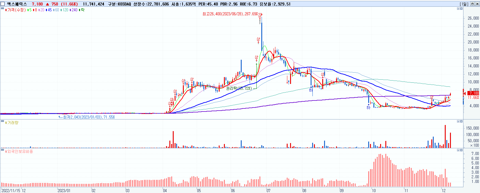 - 엑스페릭스 (7,180원 ▲ 11.66% , 시총: 1,636억, 거래량: 11,745,710, 거래대금:826억)