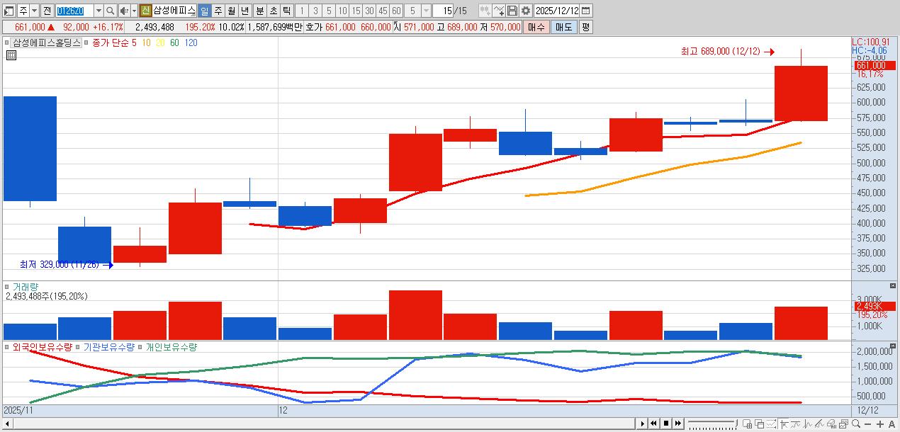 - 삼성에피스홀딩스 (661,000원 ▲ 16.17% , 시총: 164,477억, 거래량: 2,493,488, 거래대금:15,877억)