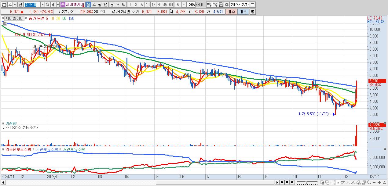 - 제이엘케이 (5,980원 ▲ 26.69% , 시총: 1,527억, 거래량: 3,937,515, 거래대금:227억)