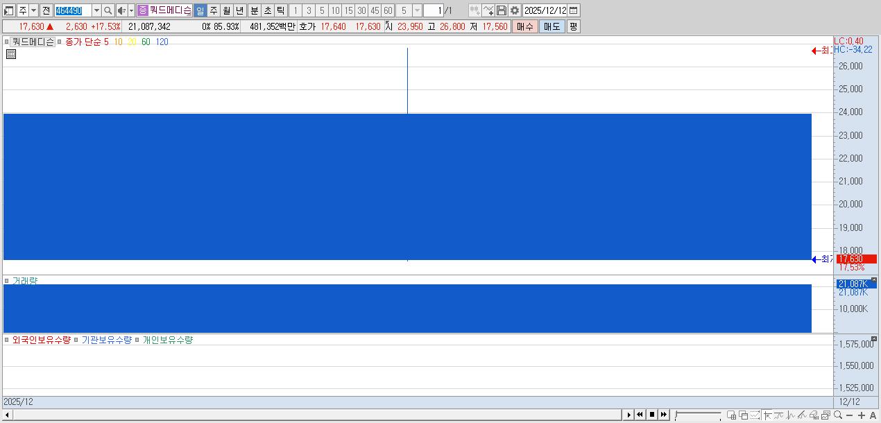 - 쿼드메디슨 (17,630원 ▲ 17.53% , 시총: 1,999억, 거래량: 21,087,342, 거래대금:4,814억)